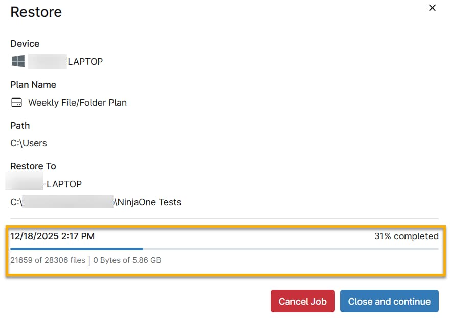 Cuando se completa la restauración del archivo, NinjaOne pasa al siguiente archivo.