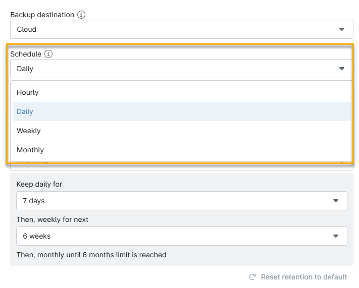 - Utilice el menú desplegable Programación para seleccionar la frecuencia con la que NinjaOne realiza las copias de seguridad. Puede elegir entre planes por horas, diarios, semanales o mensuales.