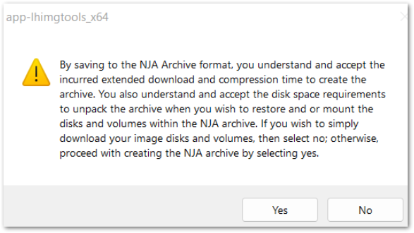 Figura 15: Confirmación de NJA (haz clic para ampliar) Si decides no guardar la descarga en formato .nja, los archivos estarán en formato VHDX y JSON sin comprimir, en formato bruto. Como alternativa, si solo necesitas seleccionar archivos específicos de la imagen, puedes utilizar la opción montaje en la nube.