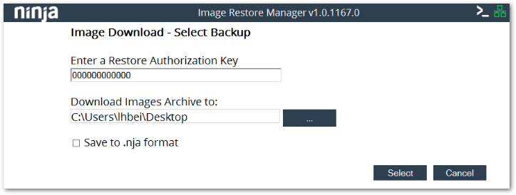 Introduce una clave de autorización de restauración y elige dónde descargar el archivo de la imagen y, a continuación, haz clic en Seleccionar para continuar.