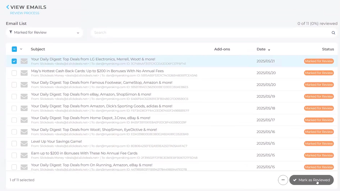 - Puede designar estos resultados para que los revise un responsable de protección de datos y así garantizar que los datos que contienen se tratan de forma adecuada. Para marcar un resultado, marque la casilla situada junto a él.
