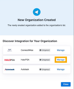 - Aparecerá un cuadro de diálogo emergente con todas las integraciones conectadas. Desplácese hasta HaloPSA y seleccione Gestionar.