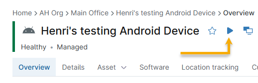 En el panel del dispositivo, haga clic en el icono de Acción para ver las acciones disponibles. El tipo de inscripción del dispositivo (propiedad de la empresa frente a propiedad personal) y el tipo de sistema operativo determinan qué acciones están disponibles. Para obtener más información sobre las acciones del dispositivo, consulte NinjaOne Endpoint Management: Gestionar dispositivos y ejecutar acciones.