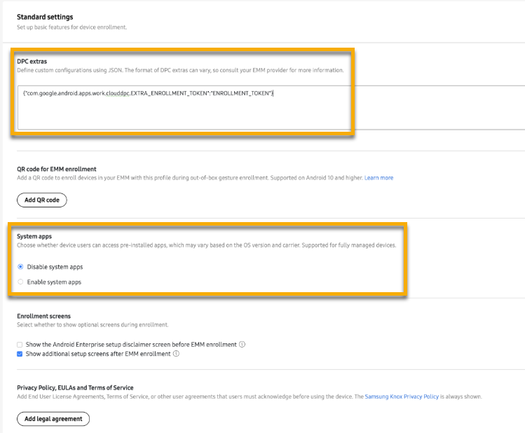 - Política de privacidad, CLUF y Condiciones de servicio: Haga clic en este botón para añadir políticas adicionales que los usuarios deben aceptar antes de completar la inscripción del dispositivo.