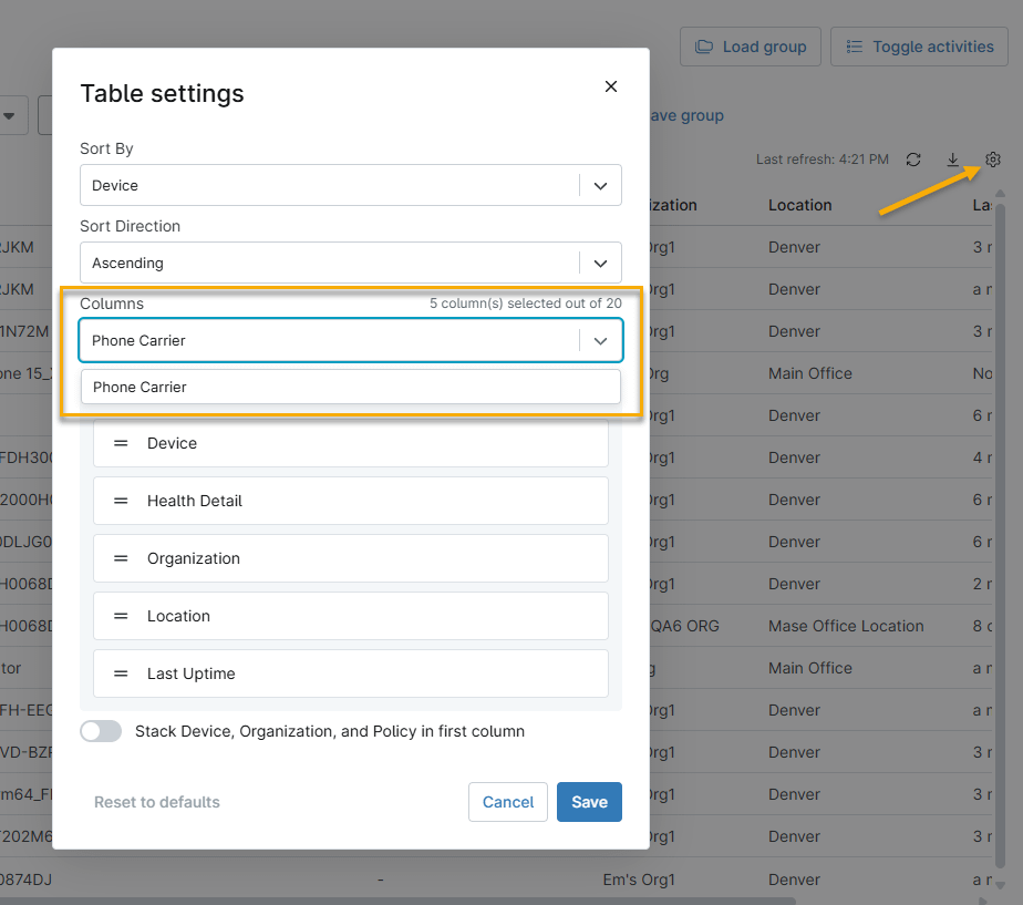 Haga clic en el icono de engranaje para abrir la ventana Configuración de la tabla y, a continuación, utilice el menú desplegable Columnas para añadir columnas a la tabla Dispositivos. Puede añadir las siguientes columnas específicas de la red móvil: