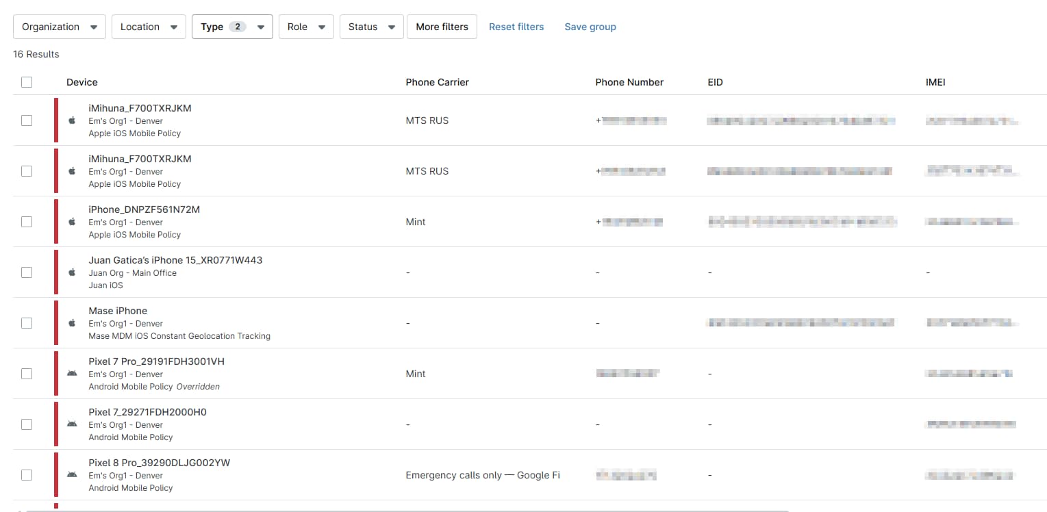 Haga clic en el menú desplegable Tipo y seleccione Android y Apple Mobile como criterios de filtrado. El panel se actualizará y mostrará solo los dispositivos móviles registrados.