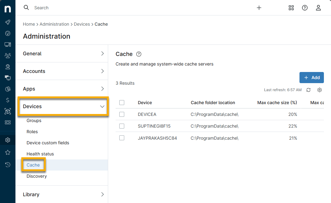 - En NinjaOne, navegue a Administración → Dispositivos → Caché.