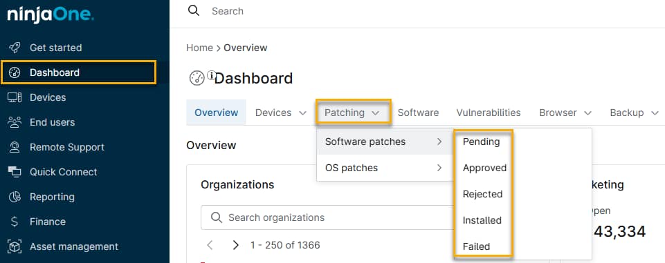 NinjaOne ofrece varias formas de ver los parches instalados en su sistema, los parches pendientes de instalación o los parches que no se han podido instalar.