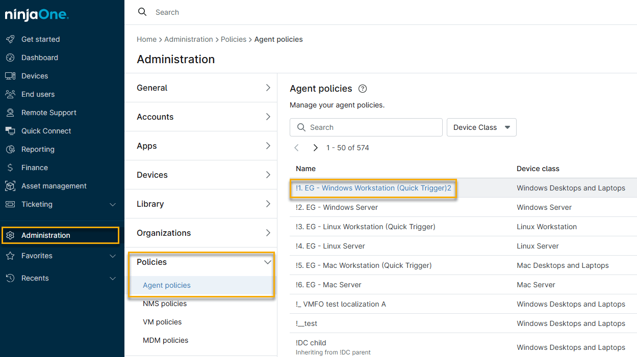- En NinjaOne, haga clic en Administración → Políticas y, a continuación, seleccione una política de Windows de la lista de políticas del agente.