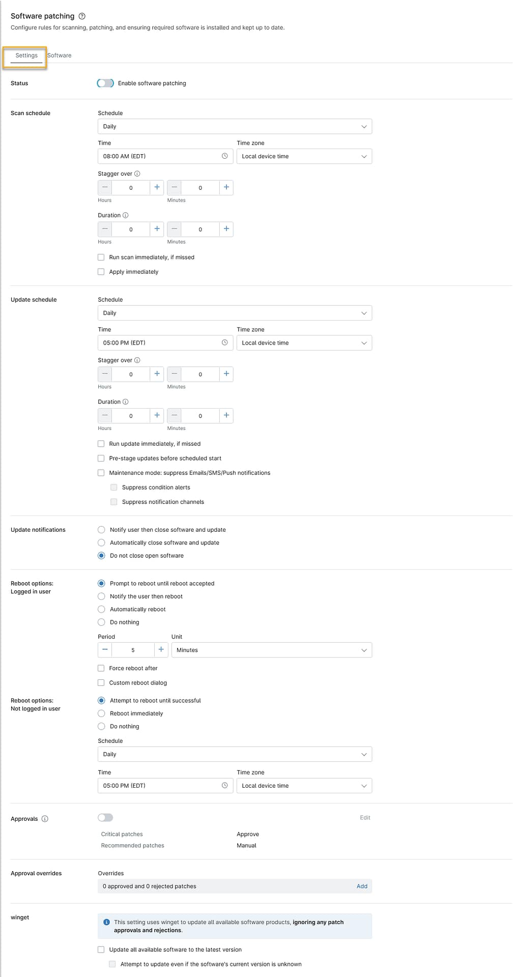 Después de añadir nuevo software, puede configurar los ajustes de aprobación e instalación para cada tipo de parche.