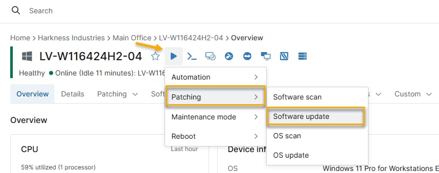 Puede ejecutar un ciclo manual de búsqueda y actualización de parches bajo demanda desde cualquier terminal. Para ello, vaya a lavista general del dispositivo, coloque el cursor sobre el botón de acción Reproducir y seleccione Parches →Escaneo de software ( para buscar nuevos parches) o Actualización de software ( para aplicar los parches existentes).