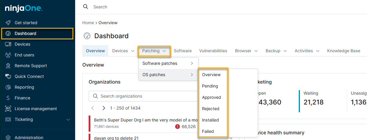 En el panel de control del sistema o de la organización , puede hacer clic en el número de la columna Dispositivos para generar una lista de los dispositivos a los que se aplica el estado del parche. Por ejemplo, al hacer clic en el número de un parche en la pestaña Aprobados, se muestran los dispositivos para los que NinjaOne lo ha aprobado, pero aún no lo ha instalado.