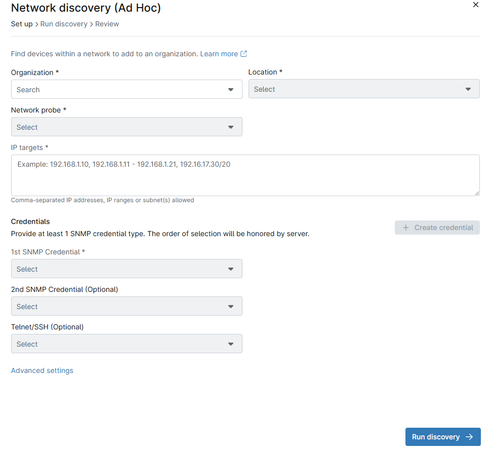 - Se abrirá el modal de configuración de Detección de red (Ad Hoc). En las listas desplegables, seleccione una organización y una ubicación. Si una organización solo tiene un área, el campo Ubicación debería rellenarse automáticamente en función de la organización elegida.