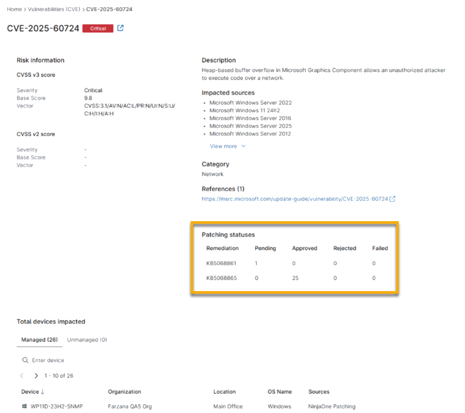 - Si accede a esta página desde el panel del sistema o de la organización, habrá una sección adicional disponible para el total de dispositivos afectados. Cuando se abre desde el panel de la organización, esta sección muestra todos los dispositivos gestionados por la organización que contienen el CVE seleccionado. Cuando se abre desde el panel del sistema, esta sección incluye tanto los dispositivos gestionados como los no gestionados, separados por pestañas.