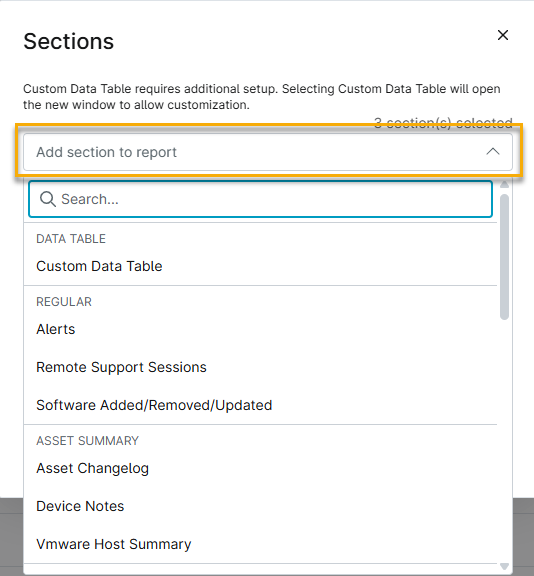 - En la ventana Secciones, utiliza el menú desplegable Añadir sección al informe para elegir las secciones de datos.