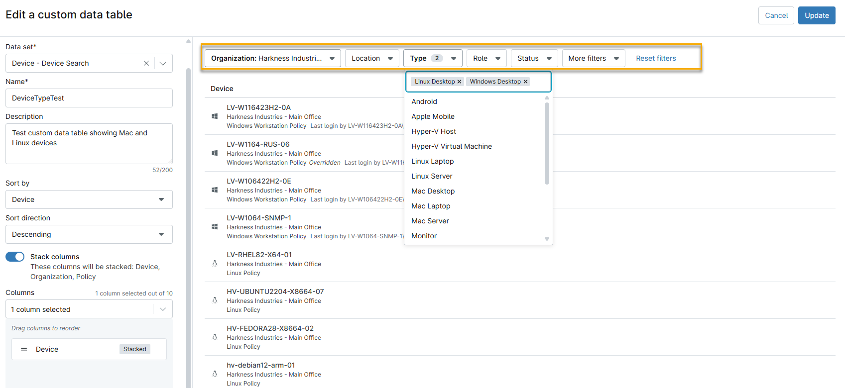 - Utiliza los campos Nombre y Descripción para asignar un nombre a la tabla de datos y describir su finalidad. A continuación, haz clic en el menú desplegable Conjunto de datos y selecciona Dispositivo - Búsqueda de dispositivos. La ventana principal se llenará con una lista de todos los dispositivos. Utiliza las opciones de filtro para limitar la búsqueda. La lista de dispositivos se rellenará para mostrar solo los dispositivos que coincidan con las condiciones de filtro.