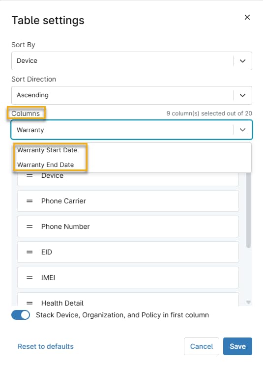 - Haga clic en el menú desplegable Columnas , seleccione Fecha de inicio de la garantía y Fecha de finalización de la garantía y, a continuación, haga clic en Guardar. Las columnas de información sobre la garantía aparecerán en la cuadrícula de búsqueda de Dispositivos.