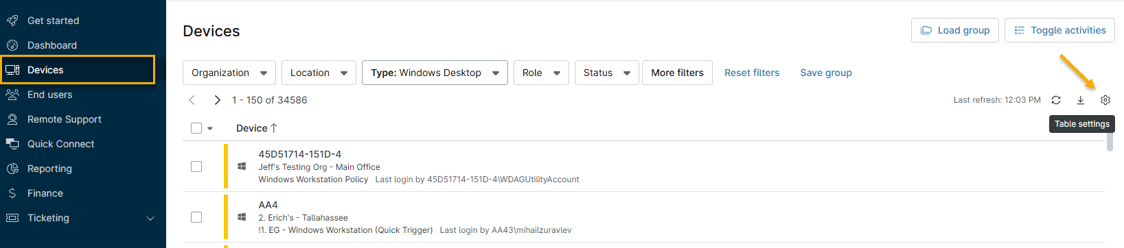 - En NinjaOne, haga clic en Dispositivos. Se abrirá la parrilla de búsqueda de Dispositivos.