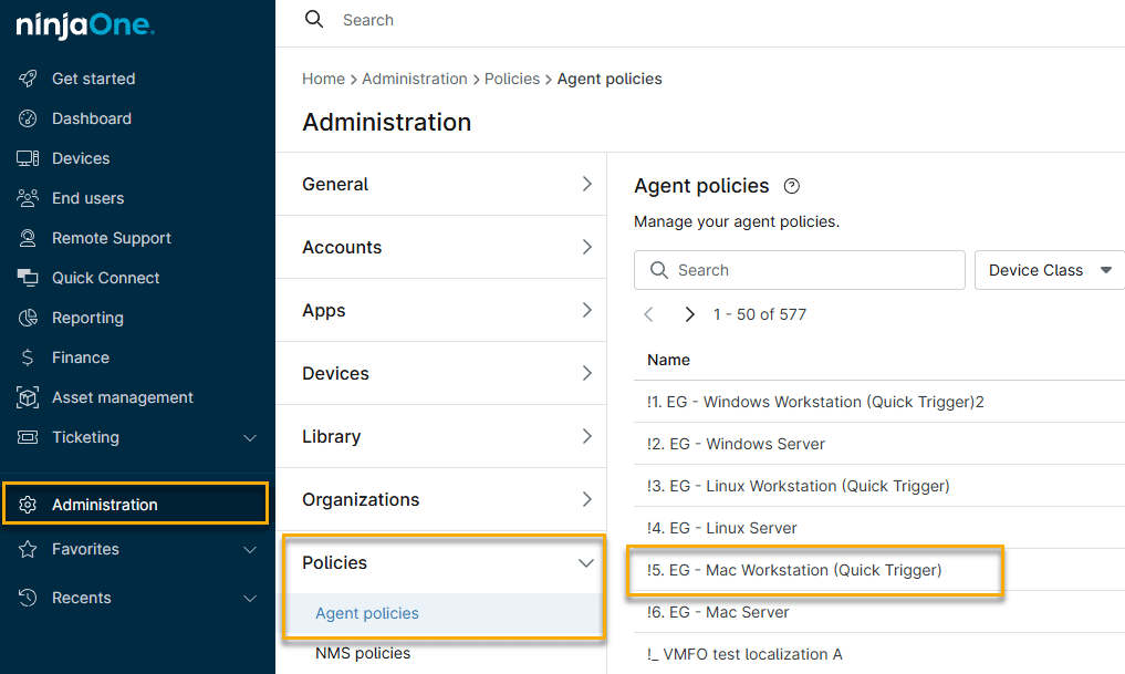 - En NinjaOne, vaya a Administración → Políticas → Políticas de agente y, a continuación, seleccione una política de la lista de políticas de agente .