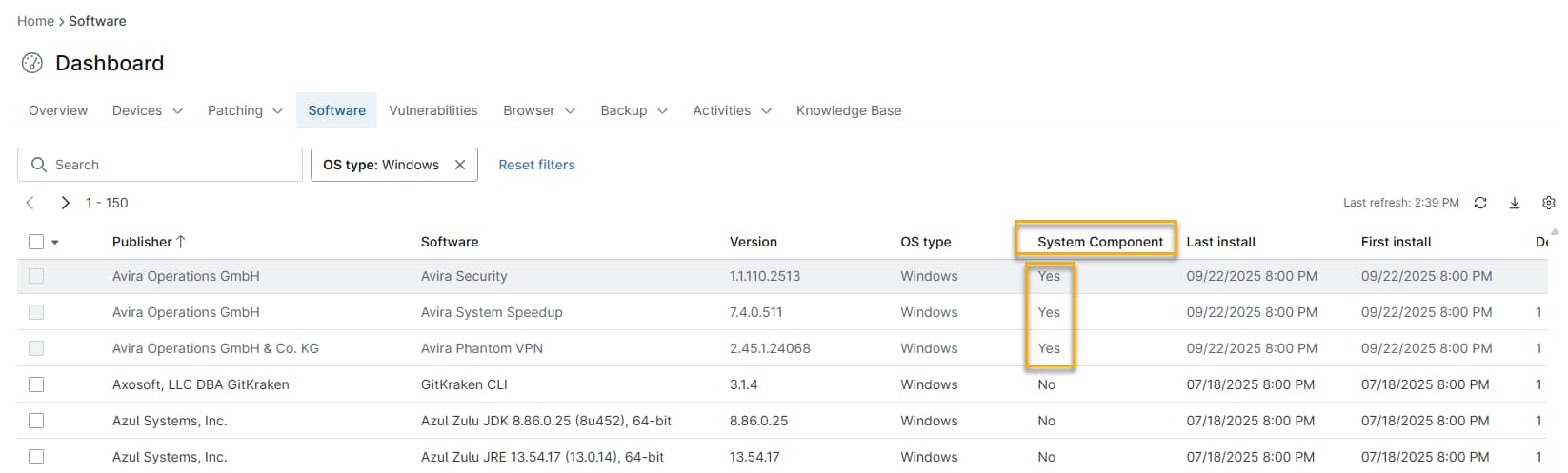 En el panel de control de NinjaOne, haga clic en la pestaña Software. Se abrirá el Inventario de software y NinjaOne indicará el software del sistema oculto con un Sí en la columna Componente del sistema. NinjaOne también incluirá esta columna en las exportaciones de la tabla Inventario de software .
