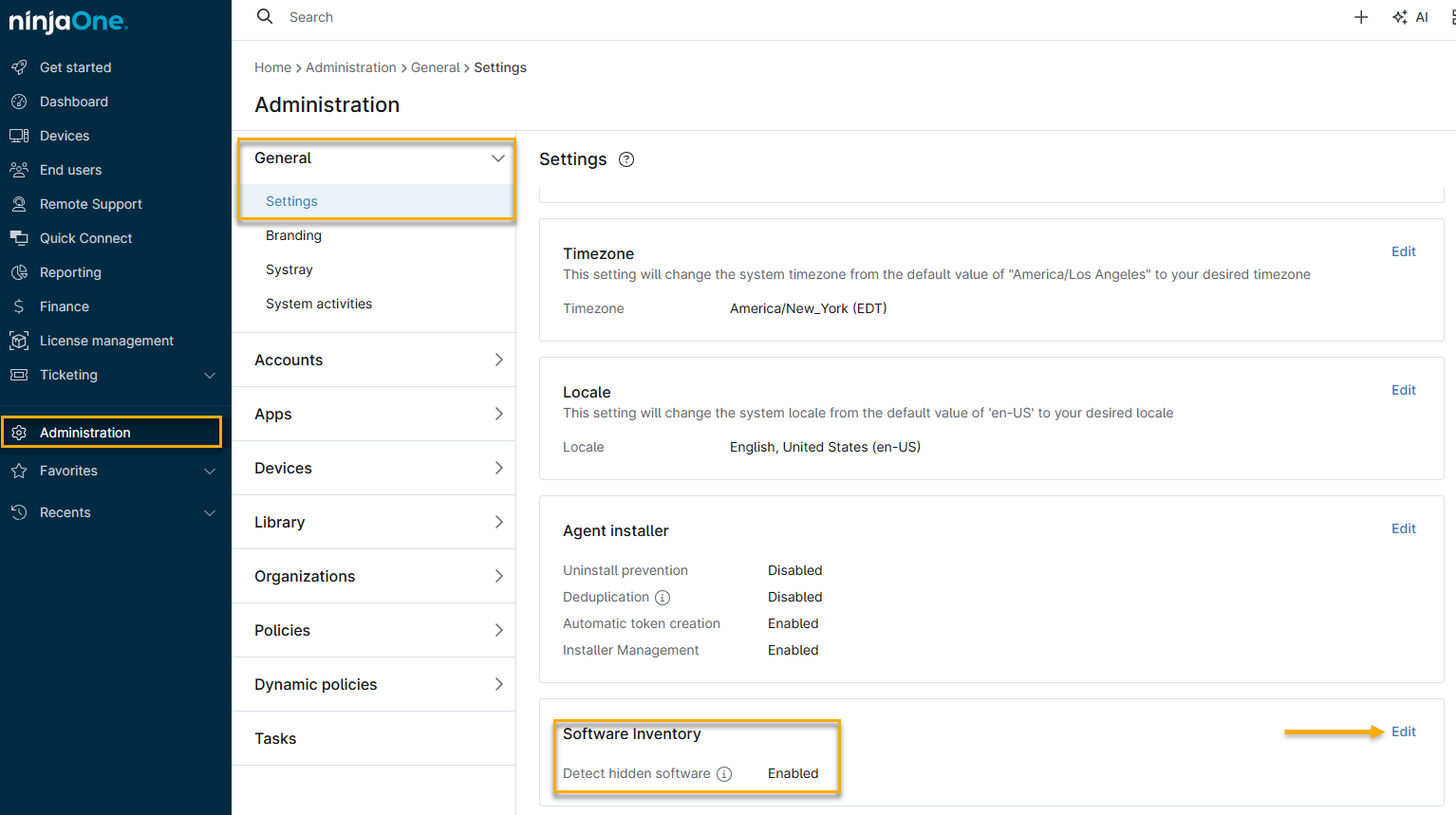 En NinjaOne, vaya a Administración → General → Configuración → Inventario de software.