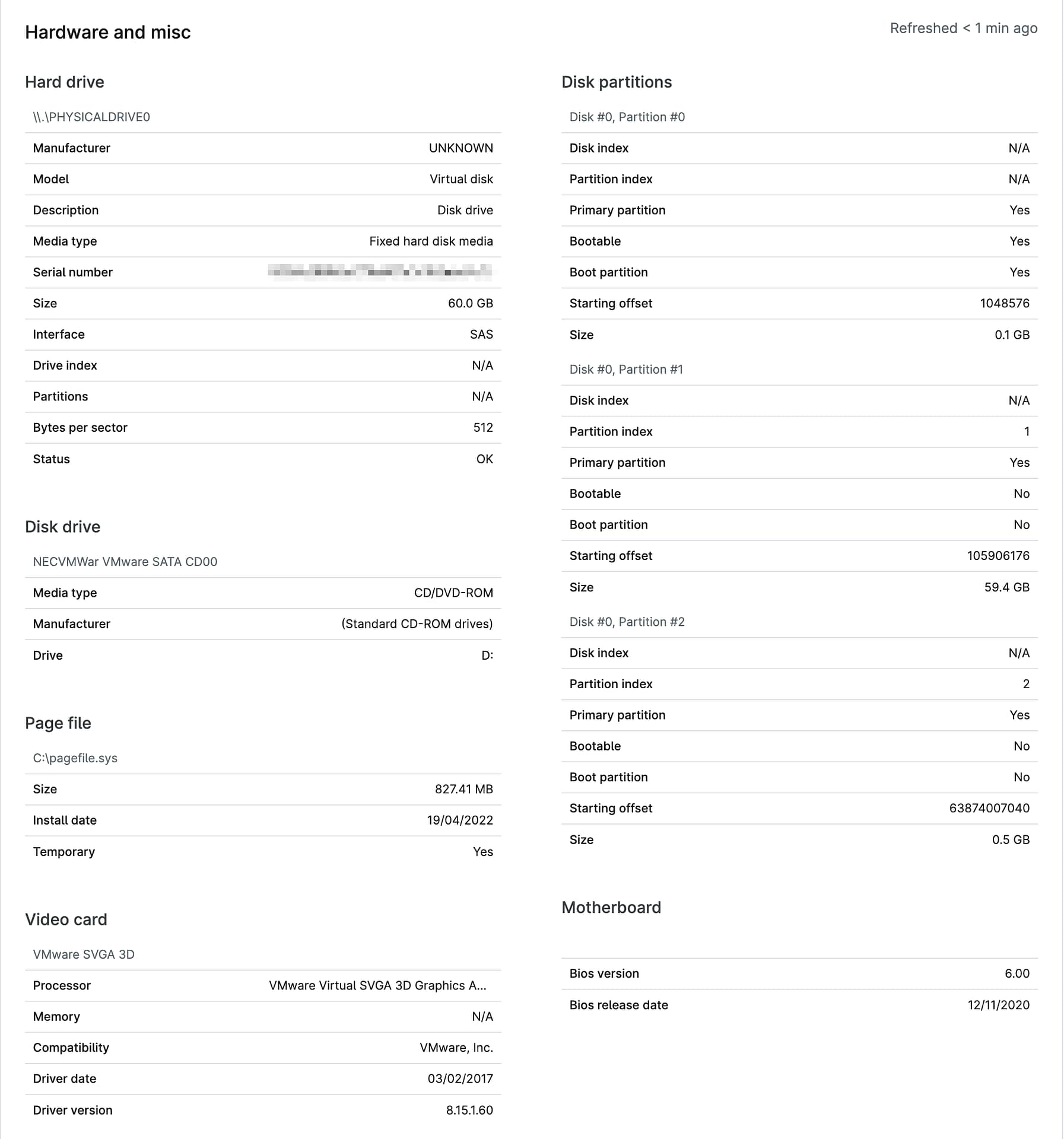 Esta sección muestra información sobre el disco duro del dispositivo, las particiones del disco, la tarjeta de sonido, la tarjeta de vídeo, la unidad de disco, el archivo de paginación y la placa base.