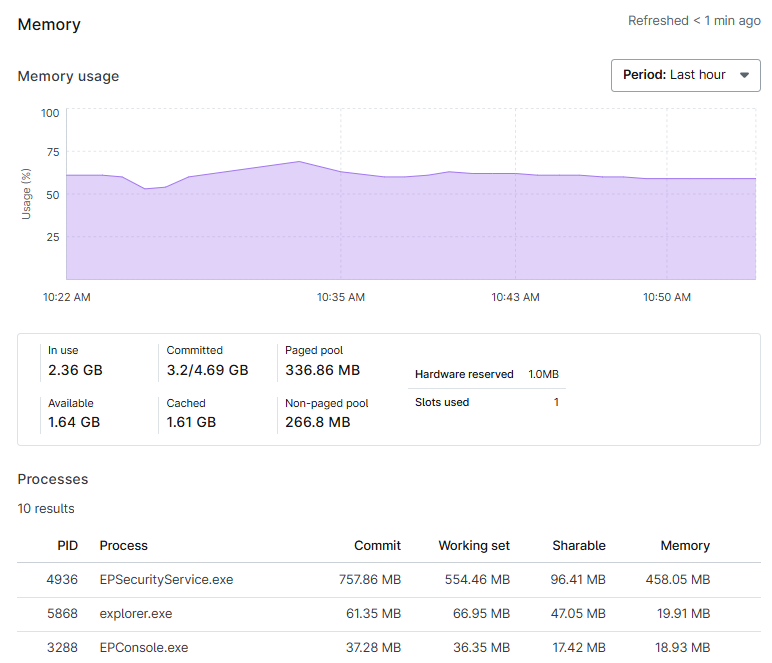 Esta sección ofrece un gráfico del uso de la memoria durante un periodo de tiempo específico y una tabla que enumera el ID del proceso (PID), el nombre del proceso, el compromiso, el conjunto de trabajo, la memoria compartida y el uso total de memoria para cada proceso que utiliza memoria en el dispositivo.