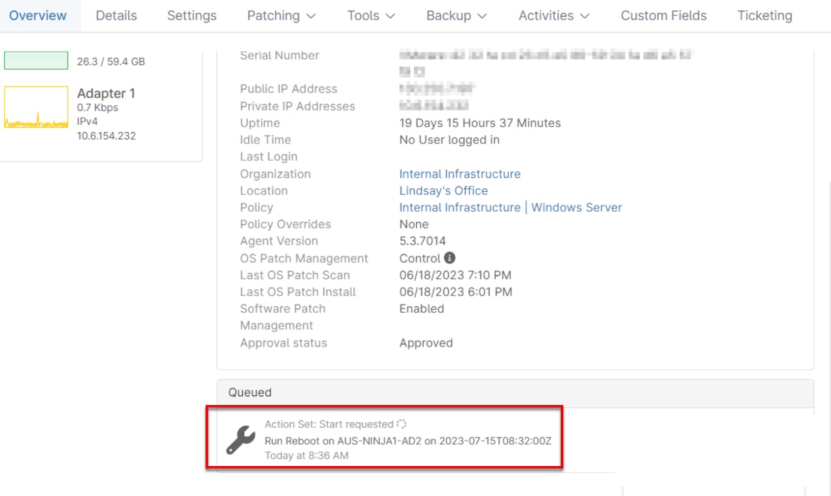 NinjaOne genera registros de actividad cuando se programa, completa o cancela un reinicio.