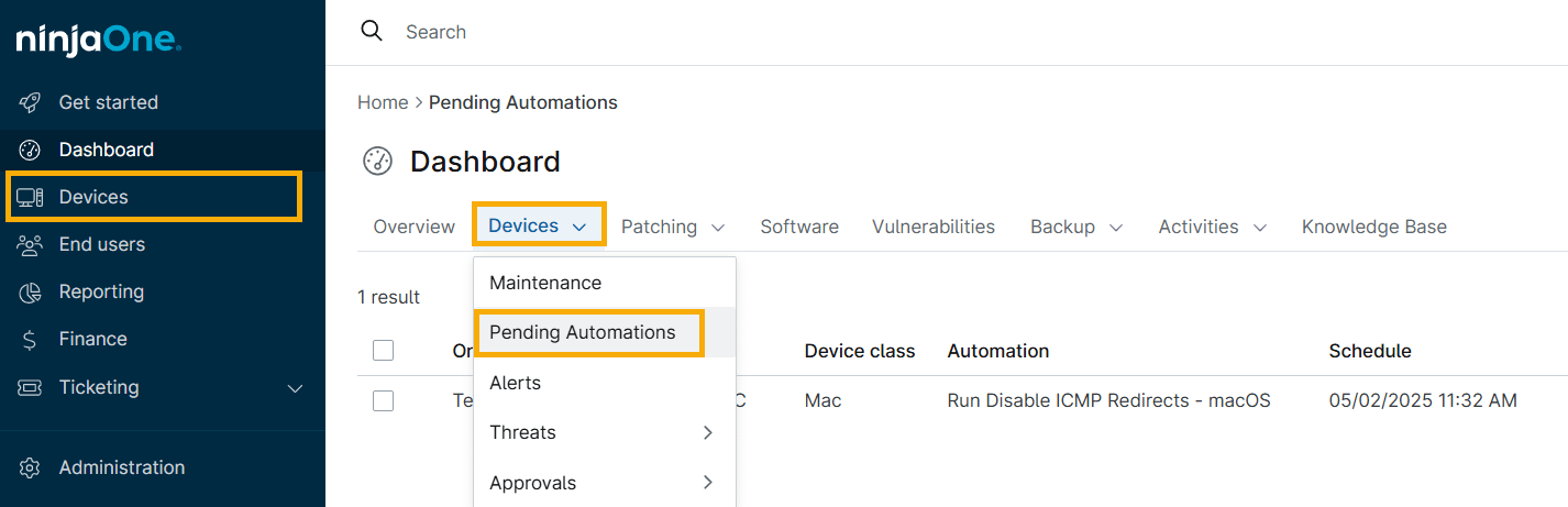 - La pestaña Automatizaciones pendientes del panel Dispositivos muestra todos los reinicios programados para una organización o para todo el sistema.