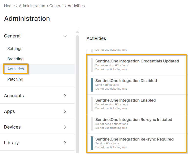 - En NinjaOne, navega a Administración → General → Actividades.