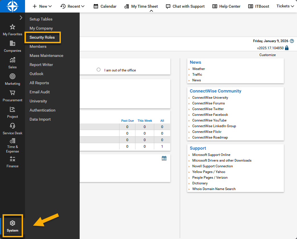 - Abra el menú Sistema y seleccione Roles de seguridad.