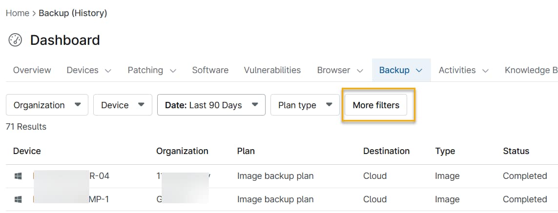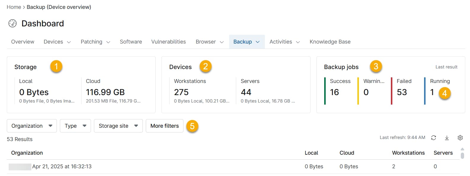 - En el panel de control global, haga clic en el nombre de la organización para acceder a la página Copia de seguridad → Información general de la organización. En el panel de control de la organización, haga clic en el nombre de un dispositivo para acceder a la página Copia de seguridad → Información general del dispositivo.