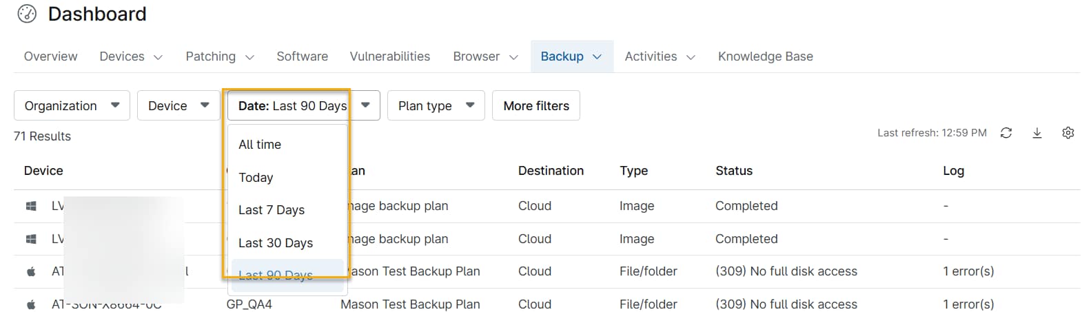 La fecha predeterminada del historial de copia de seguridad es de 90 días. Sin embargo, puede ajustarla mediante el menú desplegable Fecha.