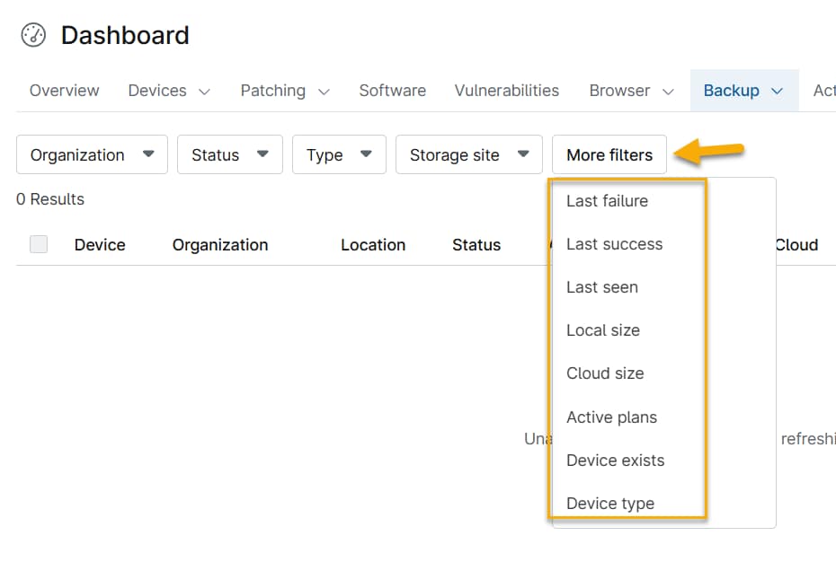 - Activado: datos de dispositivos que tienen activado NinjaOne Backup en los ajustes; configuración de la organización.