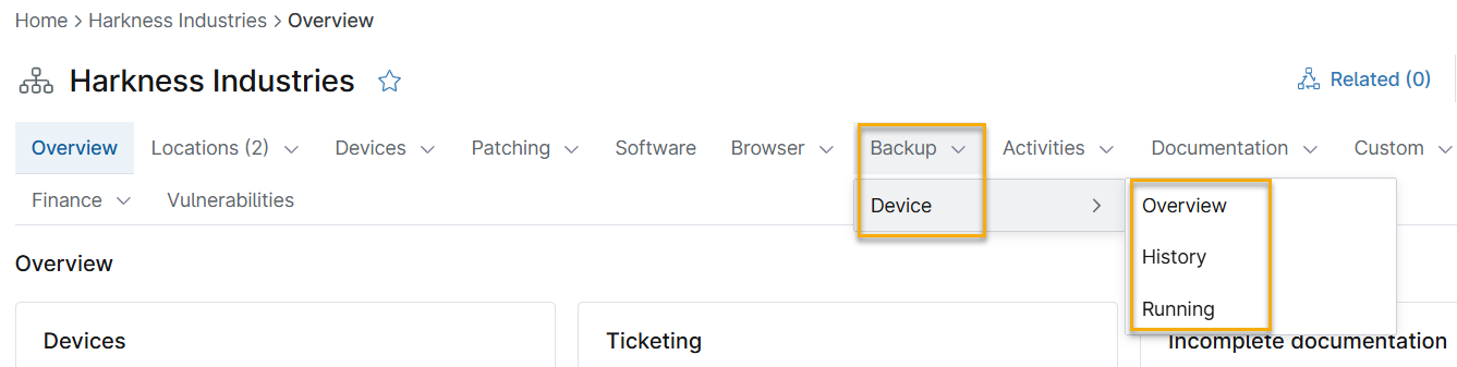 Para acceder al panel de control de copia de seguridad global, haz clic en Panel de control en el menú de navegación principal de NinjaOne y selecciona Copia de seguridad en el menú situado en la parte superior de la página. Mueve el cursor sobre Dispositivo en el menú desplegable y el menú mostrará cuatro opciones diferentes: Visión general, Historial, En ejecución y Uso.