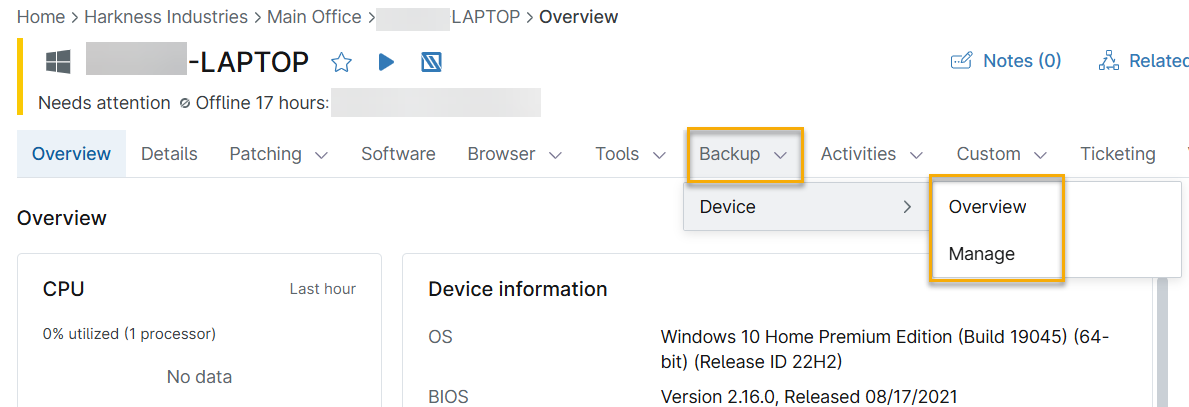 Puedes acceder al panel de control de copia de seguridad del dispositivo accediendo a un dispositivo concreto y seleccionando Copia de seguridad en el menú de navegación superior. Tendrás dos opciones diferentes para el panel de control de copia de seguridad del dispositivo: Visión general y Gestionar.