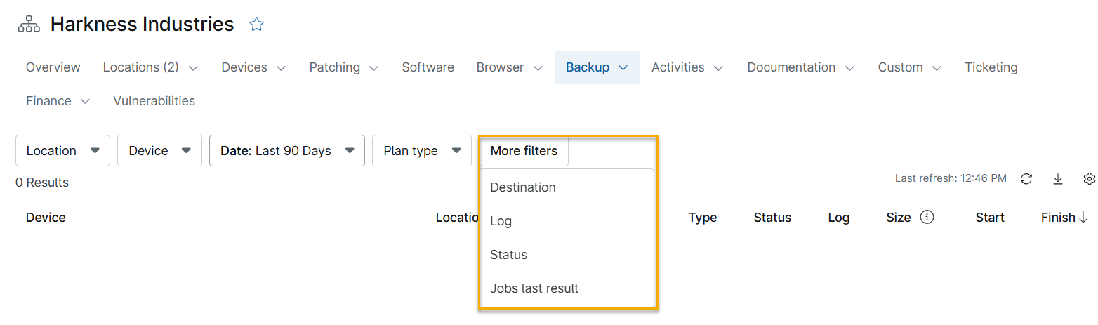 - Justo debajo de la sección Visión general, NinjaOne mostrará la lista de tus copias de seguridad. Haz clic en cualquiera de los cuadros desplegables para filtrar la lista. Puedes hacer clic en Más filtros para ver opciones de filtrado adicionales.