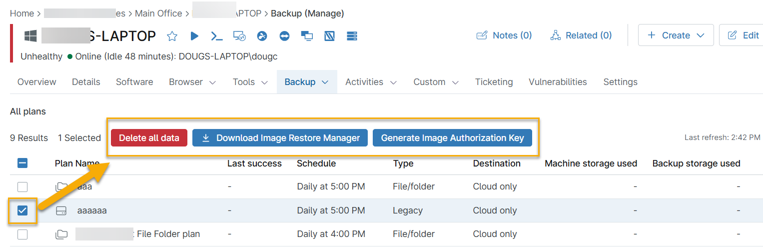 Si activas la casilla situada junto a un dispositivo, aparecerán algunas acciones en la parte superior de la lista. Para todos los dispositivos, independientemente de su estado, puedes acceder directamente al gestor de datos de copia de seguridad de ese dispositivo.