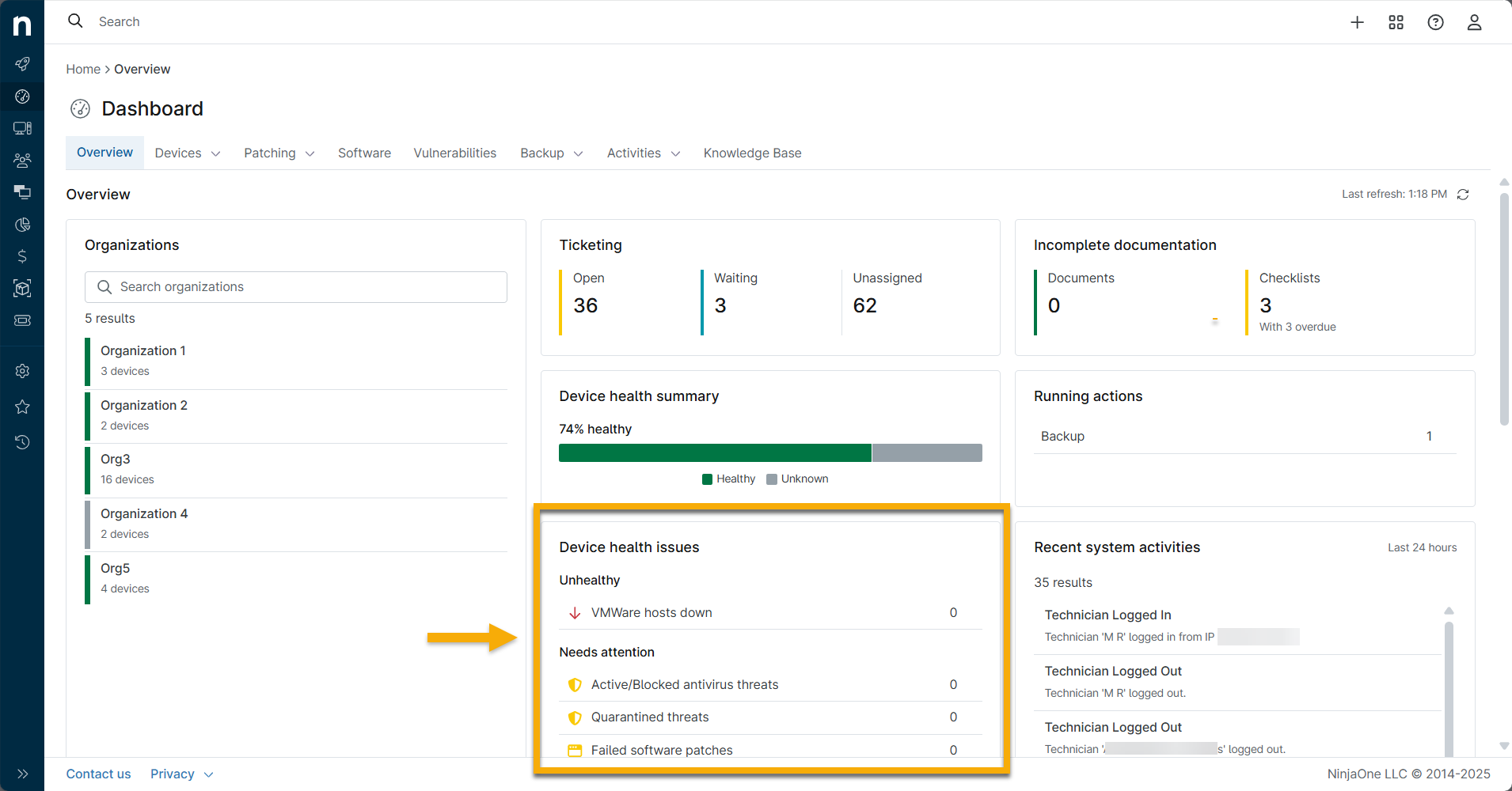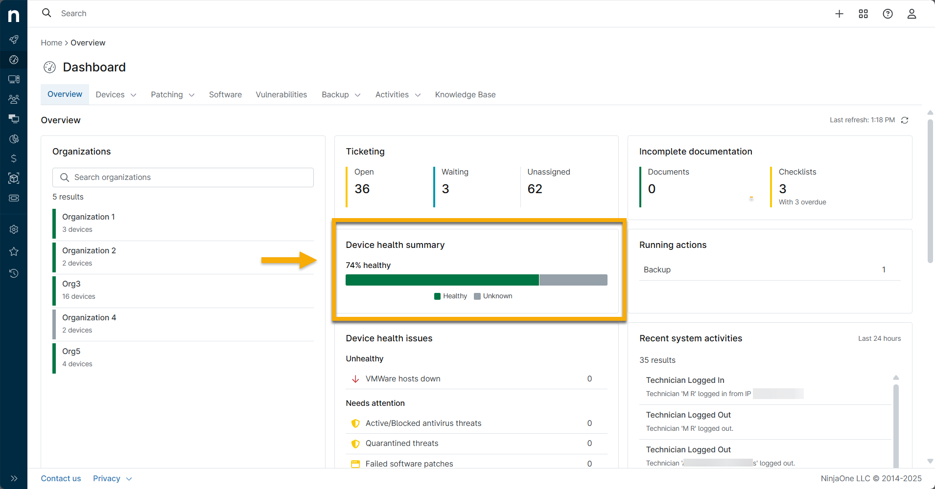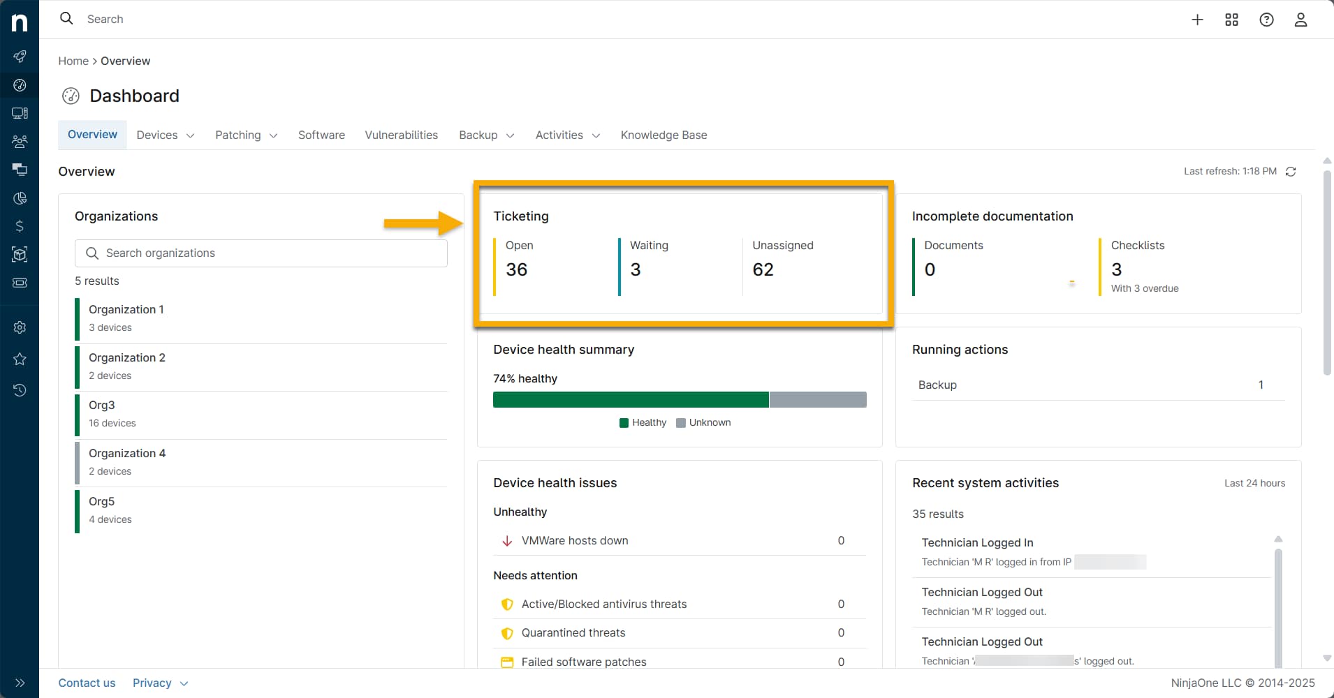 - Sistema de tickets de NinjaOne: paneles de control de dispositivos y organizaciones