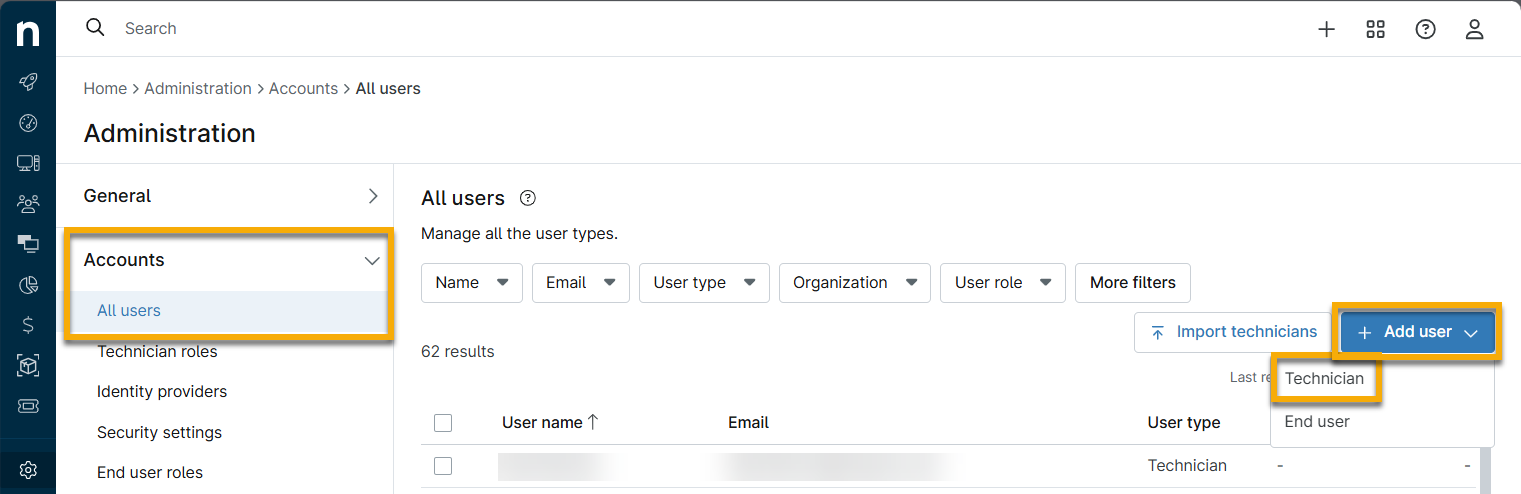 - Vaya a Administración → Cuentas → Todos los usuarios y, a continuación, haga clic en Importar técnicos.