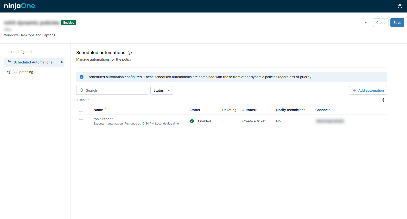 Los administradores y técnicos de NinjaOne pueden crear, editar y eliminar políticas dinámicas en toda la organización desde una única ubicación dentro de la plataforma. Para más información, selecciona un tema para continuar.