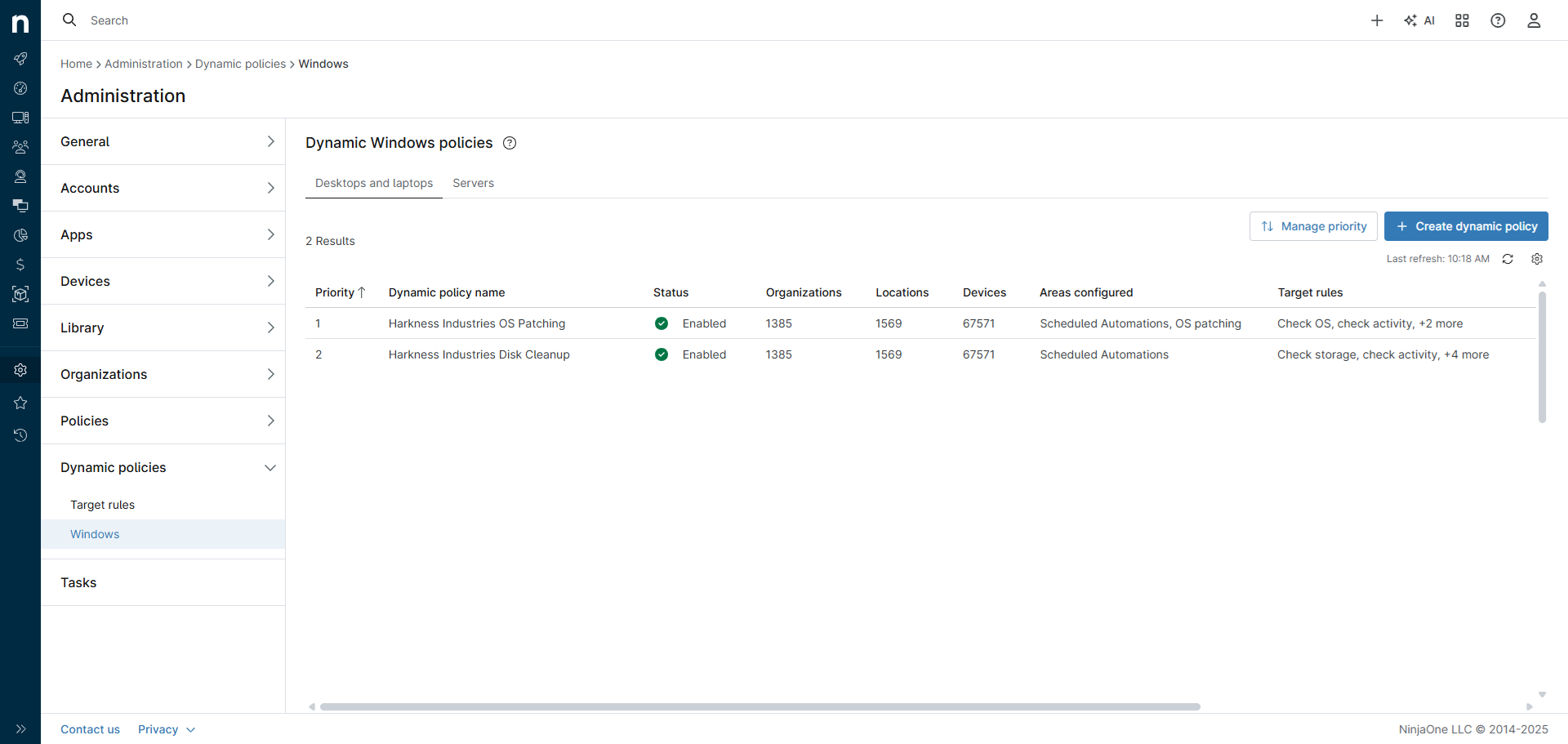 Puedes gestionar las políticas dentro de la plataforma NinjaOne en Administración → Políticas dinámicas → Windows.