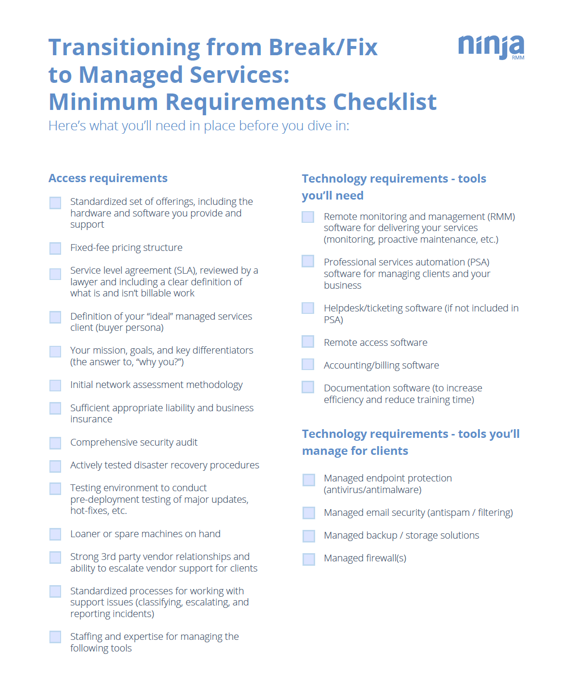 Passer d’un service de type Break/Fix aux services gérés n’est pas une mince affaire. Pour vous aider à comprendre ce que cela implique, voici une check-list des éléments essentiels à mettre en place avant de franchir le pas. Cliquez sur l’image de la check-list ci-dessous pour la télécharger au format PDF.