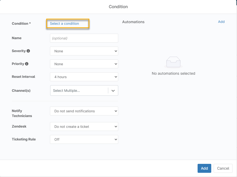 Si la condition se déclenche, vous pouvez ajouter un script pour installer ou exécuter une application afin d'y remédier. Cliquez sur Ajouter dans la section Automatisation de la fenêtre de l'éditeur de conditions . Cette action affiche une liste de tous les scripts natifs et des scripts que vous avez ajoutés dans la bibliothèque d'automatisation NinjaOne.