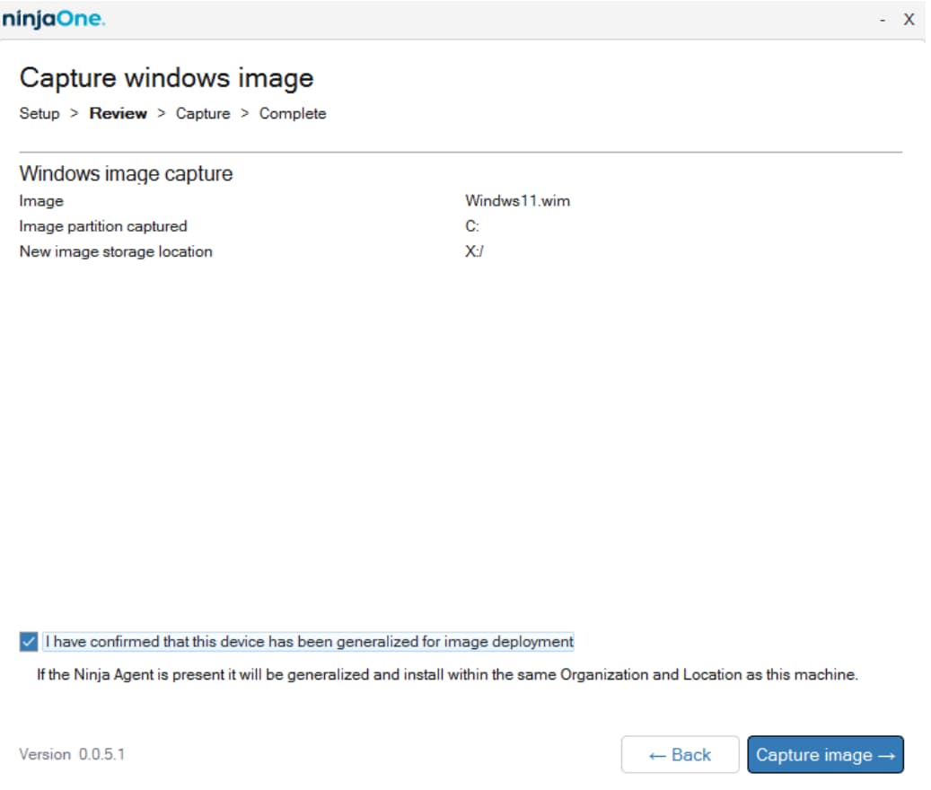 - Sur l'écran récapitulatif, vérifiez que les détails de la capture sont exacts. Ensuite, cochez la case pour confirmer que vous utilisez une image Windows généralisée et cliquez sur le bouton Capture Image .