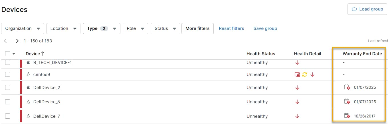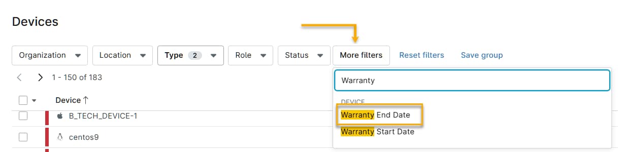 Vous pouvez utiliser le filtre « Date de fin de garantie » pour trouver les appareils dont la garantie arrive à expiration.
