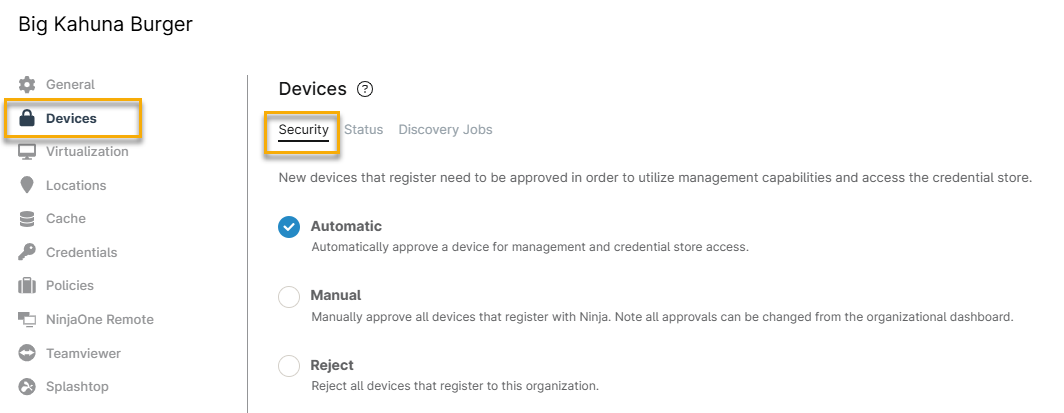 - Manuel : L'administrateur du système NinjaOne doit approuver ou rejeter manuellement les nouveaux appareils.