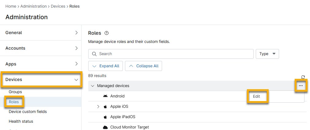 - Placez votre curseur sur un rôle de périphérique, cliquez sur l'icône Action (ellipse) et sélectionnez Modifier.