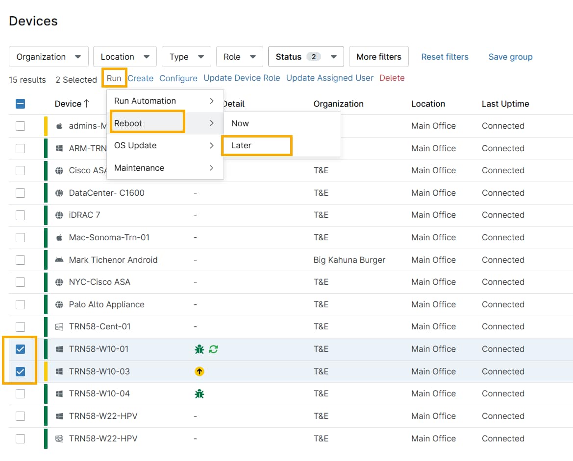 - Les appareils doivent être du même type et appartenir à la même politique. Vous pouvez effectuer des redémarrages pour plusieurs appareils avec des politiques différentes, mais pas les planifier.