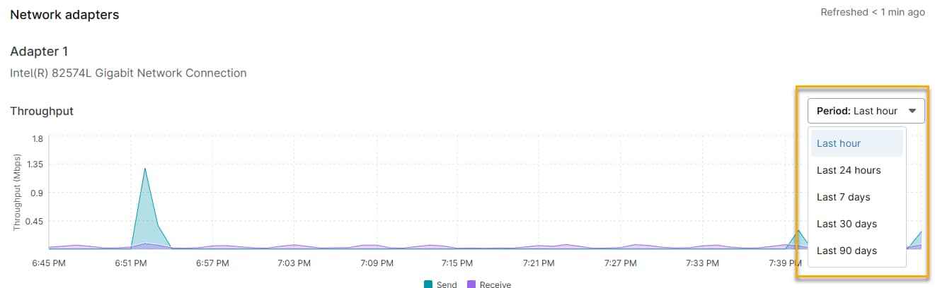Plusieurs sections détaillées sur les appareils, notamment CPU, Memory, Disk Usage, Disk Transfer Rate, Disk Active Time, et Network Usage Data Points, vous permettent désormais de visualiser les données sur une période allant de la dernière heure aux 90 derniers jours, pour une surveillance et un dépannage plus complets.